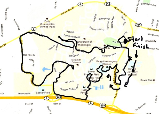 I printed a map of the campus and tried my best to draw the route I took. The route was supposed to be considerably shorter than what it ended up being. It began and ended at the Ole Miss Inn. The arrows point in the direction that I started. There you have it.