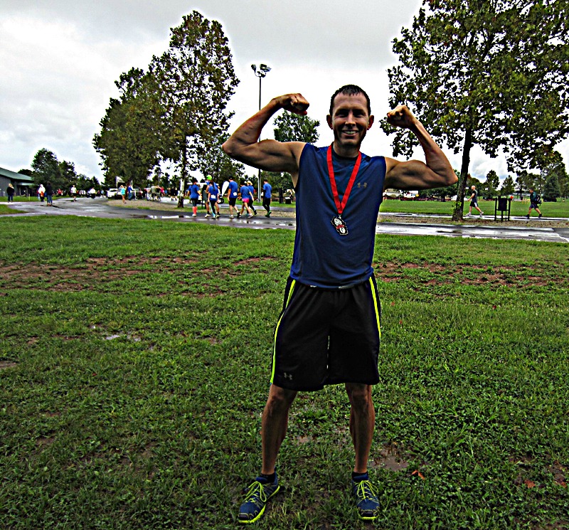 It didn’t take me long to figure out that the course wasn’t going to bring me back around to the drop point and that I had done something wrong. I wasn’t about to go back, nor was I willing to just drop the sandbag and pick up my pace. I was going to carry that blasted thing until I saw the next volunteer just to make sure. I’ve race and trained for enough Spartan Races to have it engrained it me to take no shortcuts. As it turns out, the next volunteer was a long, long, long way away! I carried that 25 – 30 pound bag for approximately a mile. Not a figurative mile, but a literal mile. I carried it through creeks and up and down muddy inclines. I carried it through the ‘spider web’ obstacle of 20 feet or so of bungee cords zig-zagging across the path. I carried it through tire obstacles. I carried it uphill and downhill. It caused me to fall down an embankment. I picked it up and continued. It slowed my pace considerably, but I didn’t stop running until I finally came upon volunteers at the first set of walls. I asked them kinda sheepishly “I’m not supposed to still have this sandbag, am I??” They laughed and gave me a solid “NO!” Oh well, that was good training and I’ll be doing a lot harder things than that in 2 weeks. I only wish I could hear the conversation when the obstacles were being dismantled. I’m sure somebody said “How did that sandbag get over here??!!” After dropping it, I was finally able to pick my pace back up and when I saw my Dad and heard my daughter yelling at me near the end of the race, I picked up another notch and finished strong. The finish actually came upon me kinda suddenly and I still had a lot more left in the tank, which was slightly disappointing, but at least I finished without worsening my injury.