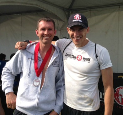 As you can see from the photo above, the starting line began away from the festival area and shot you straight up a hill before it leveled out into the woods. Although it had rained heavily the day before, the course wasn’t overly muddy. There was a decent amount of running under tree cover and a good percentage of that was spent ducking under or pushing overhanging tree branches out of the way…..one of the times that it did not pay to be tall. Spartan Race introduced the “Gamble” in this sprint. The course came to a fork. Left was .2 miles, but technical and hilly. Right was .3 miles, but easier terrain. I chose left. I don’t know why. I just went with it. I’m unsure if I gained or lost ground when the two routes came back together. The Herculean Hoist was back again without the pulley system, which makes this a lot more difficult than it used to be. I didn’t let it defeat me this time and left several burpee-ers in my wake. The race looped back to the festival area which was jam-packed with obstacles: rope climb, run down the hill, sandbags up the hill and back down, horizontal traverse wall, and slippery wall before finally heading back up the hill. By the horizontal traverse wall, the leaders were in my sight and I was gaining on several…..until another slip-up on the traverse wall. The burpee penalty took a lot out of me and I didn’t get back to full speed for awhile. From that point on, I was locked in a battle with my Mud and Adventure Teammate, Paul Buijs. Loser had to do 30 burpees. I already owed him 30 from Utah and I didn’t want to add anymore. I kept thinking I had pulled away from him, only to hear him calling out my name just a few yards back. He gave me the motivational push that I needed. A muddy, rocky barbed wire crawl preceded a short sprint to the fire jump and then a mad dash back down the hill to the finish line. I avoided the penalties and finished in 71st place out of approximately 325 in the elite. I’m improving each race and that is all I can ask from this long road back from the injuries.