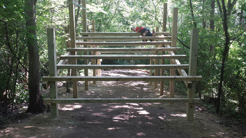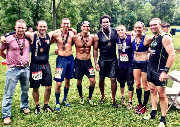 If lining up beside Dhani Jones, Amelia Boone, & Junyong Pak wasn’t intimidating enough, the sprint up the first hill to begin the course was. I will try to limit my use of the word ‘hill’ in this post, but there were lots of them and steep ones. REALLY steep ones. I didn’t rush out too fast because I had glimpses of what was in store over the next 5 miles. Monkey bars, hills, rope climbs, hills, log carries, hills, log drags, hills. Not in the beginning and not in that order, but you get the picture. As we looped back to the festival area we were met with the first real set of obstacles…. a gauntlet of them. First was an electric fence crawl. Then walls. Next was a ridiculous monkey bar obstacle that only a few completed the way it was designed to be crossed. Words aren’t adequate. See the picture. The picture isn’t adequate. You should just come see it for yourself. After that, a series of over under logs in muddy water. Immediately following that was the castle tower, a 30 foot obstacle to scale up and over. See the picture. Then there were hills. Rocky hills. Technical running. Fun running! My kind of race! Lots of use of the natural terrain, especially logs. Mud Guts & Glory likes their logs. I may have forgotten to mention that were hills. Beautiful scenery throughout. Probably my favorite obstacle and a challenging one was the weaver ladder. You had to navigate over, under, over, under, etc., without letting your feet touch the ground. There is a technique to this. There was a sling shot obstacle…very cool. There was also a sternum checker obstacle that was navigated by running up logs and leaping on and over a suspended log. That was fun, but make sure you do it right the first time. Near the end of the race a very long, very steep decline took you down into the ravine. This involved a semi-rappel because it was too steep to run down. You go down and then you go back up. The ascent was worse and required both upper body and lower body strength to pull yourself up the 50 or 60 yard cliff while the dirt slid out from underneath your feet. Once again, see photo below! Finally, a short run to a long, fun water slide. Out of that and then sprint 100 yards to the end. I finished 7th overall, but I ran this mostly for fun as were most of my OCR colleagues. Local boy and my friend, Taylor Clark, finished 3rd overall proving once again that he is among the best in obstacle racing.